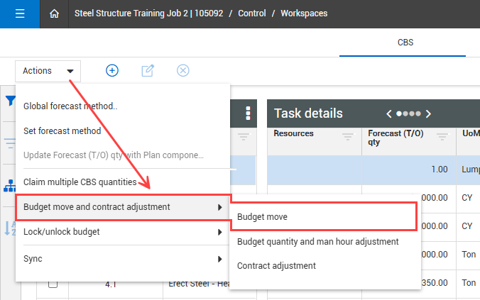 To launch a budget move in Control, from the CBS tab of the Workspaces module, select Actions > Budget move & contract adjustment > Budget move. This opens a Budget move record with the option to fill out the record following one of two workflows.