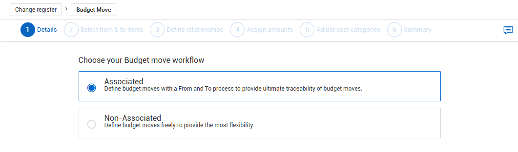 Select the Associatedoption and add budget move details as needed, and then click Next.