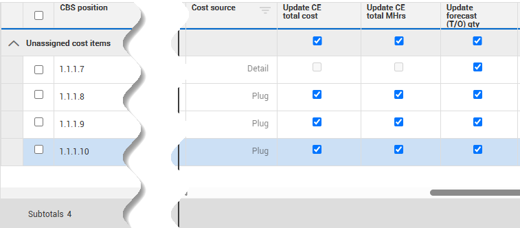 The Update CE total cost and Update CE total MHrs check boxes are active for plug cost source only. The Update CE total cost and Update CE total MHrs check boxes cannot be edited for Detail cost items because cost is driven by your associated resources.