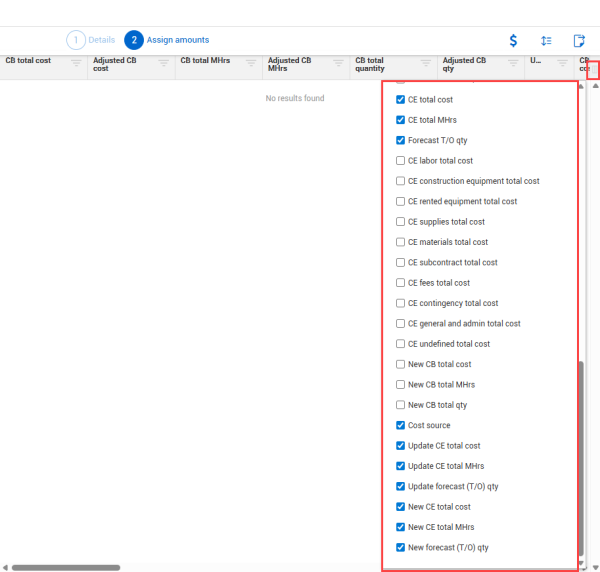 To add these columns, initiate a non-associated budget move, go to the Assign Amounts step, click the Column chooser icon, and then select your columns.