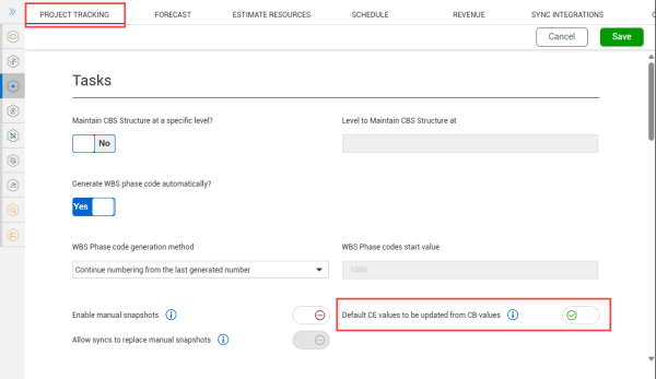 For more information, see the Default CE values to be updated from CB values section in Project Tracking, Tasks settings.