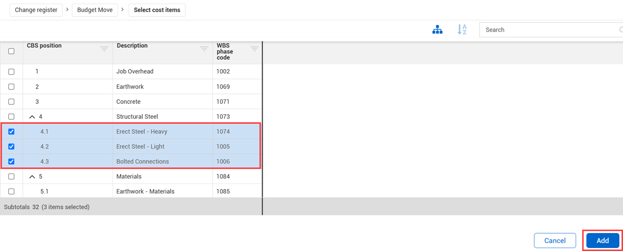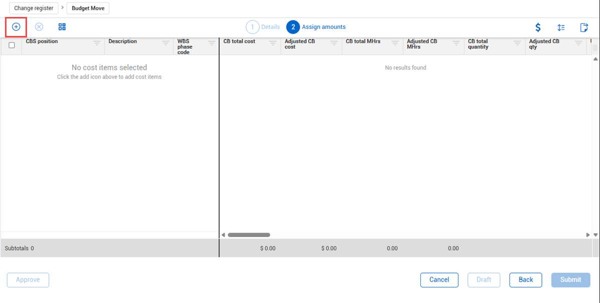 3. In Assign amounts, click the Add button to select the cost items that are part of the budget move.