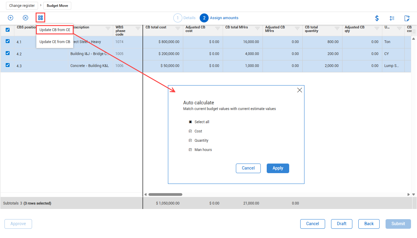 • Update CE from CB - When approved, automatically updates current estimate values in the CBS based on adjustment values defined on the non-associated budget move.