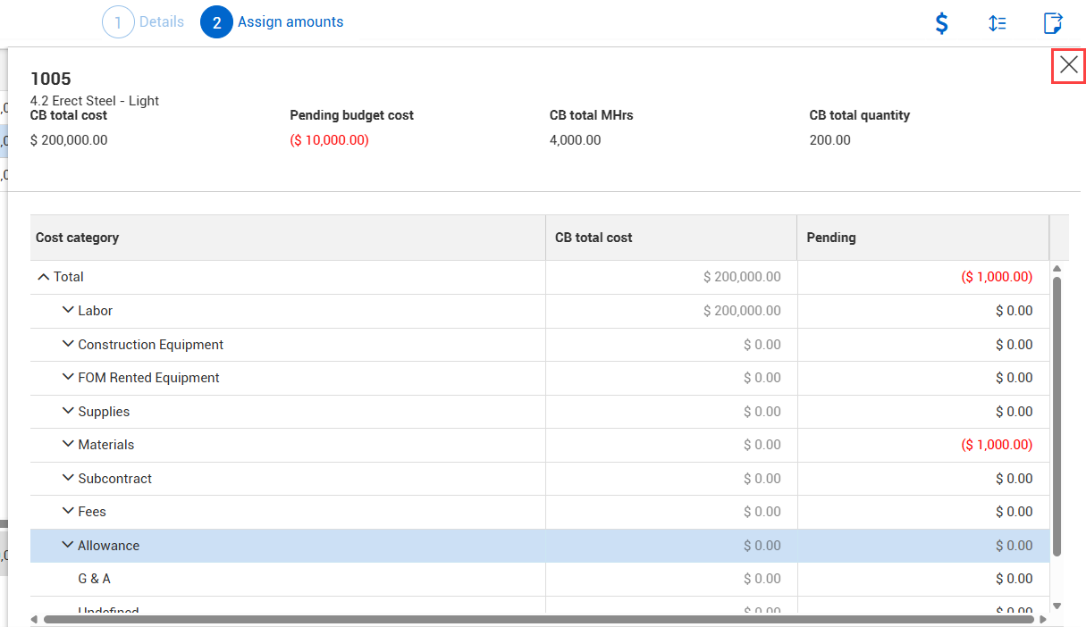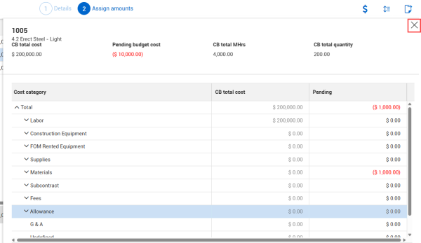 After making adjustments, click the Close icon at the top right corner to close the Cost category slide-out.