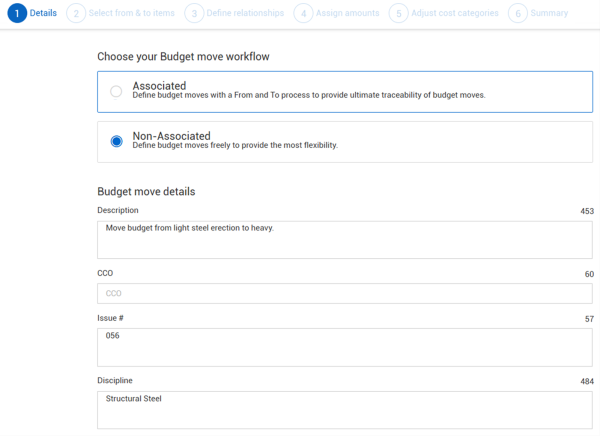 2. In Details, select the Non-Associated option and add budget move details as needed, and then click Next.