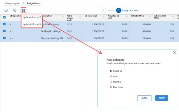 • Update CB from CE – Automatically generates CB adjustments in the non-associated budget move record to match existing current estimate values of the cost items selected.