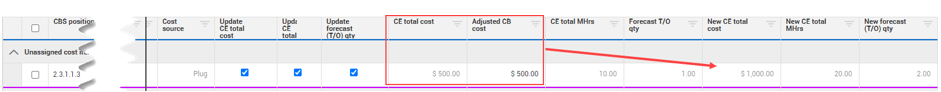 For example, if the Update CE total cost box is checked, the Adjust CB cost is added to the CE total cost after the contract adjustment is approved. You can preview the results in the New CE total cost, New CE total MHrs, and New forecast (T/O) qty columns.
