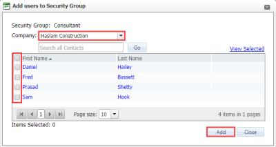 At Add users to Security Group select the company then the contacts.