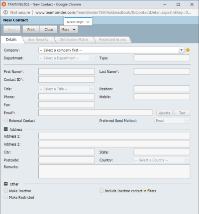 Enter the Address Details for the contact which include: Address Line 1, Address Line 2, City, State, Postcode, and Country. |