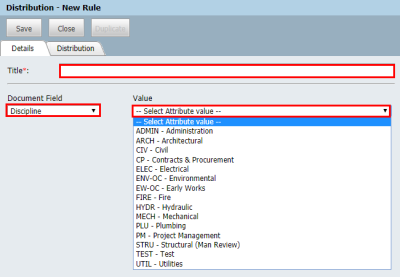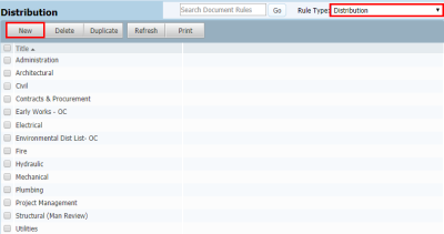 Click New and enter a Title for the Distribution Rule (e.g. “Distribution of Electrical and Fire Drawings”).