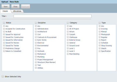 The rules for who can upload documents for this Upload Group are controlled using any of four key document attributes which are: Status; Discipline; Category; and/or Type. Any indicates any value is visible or individual items can be selected.
