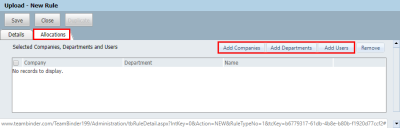 Assign the required companies to the Upload Rule by using Add Companies and moving them from the left hand pane to the right hand pane. Alternatively use Add Users or Add Departments.