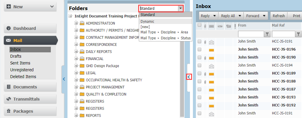 Dynamic Folders can be used to automate both the creation of folders and the filing of mail in within those folders based on key metadata assigned to each mail item. Select from the drop-down list of options at the top of the folders pane to display any Dynamic Folders.