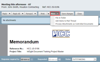 Open the mail and select File in Folder from the More button drop down list. The File in Folder Screen will now load.