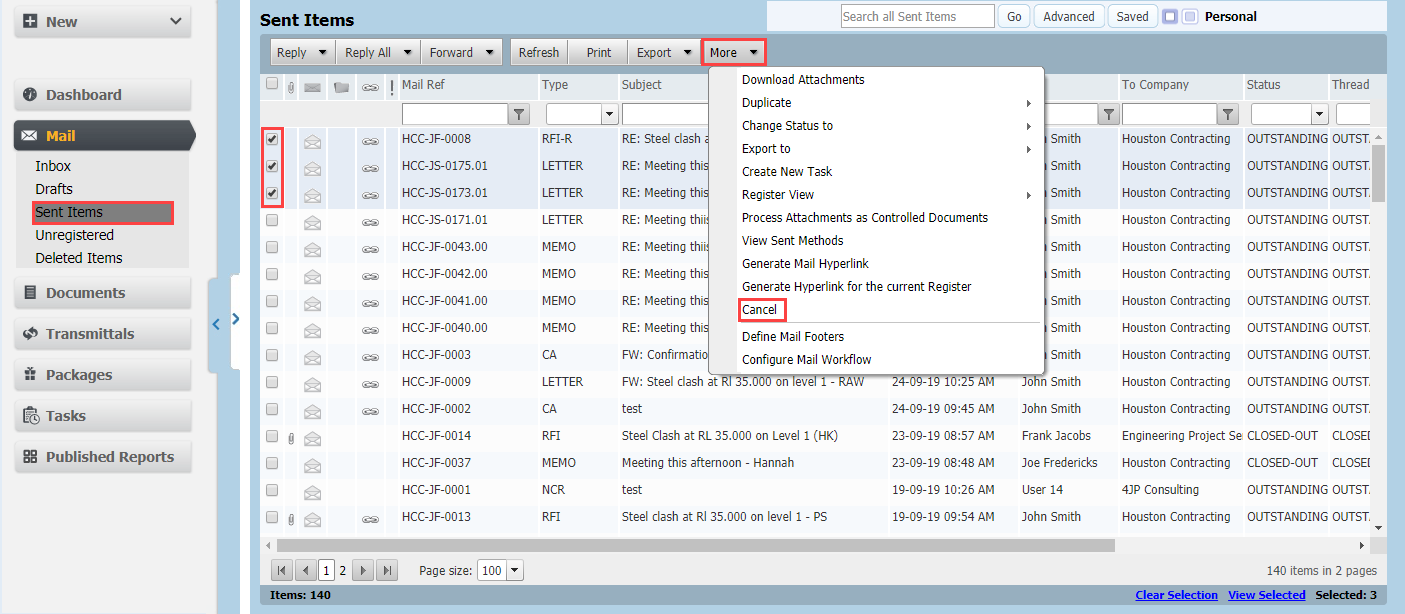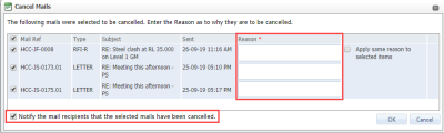 To cancel mail, the user must have been granted relevant permissions including send access to that mail type. The mail must also have been sent by a user in the same company. The ability to cancel mail can be restricted to the Project/Company Administrators, and/or Company Users, and/or Senders from within Project Settings.