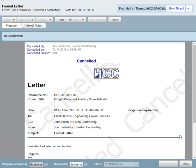 Cancellation details will now appear at the top of the mail and a cancelled watermark will be displayed on each page of the mail.