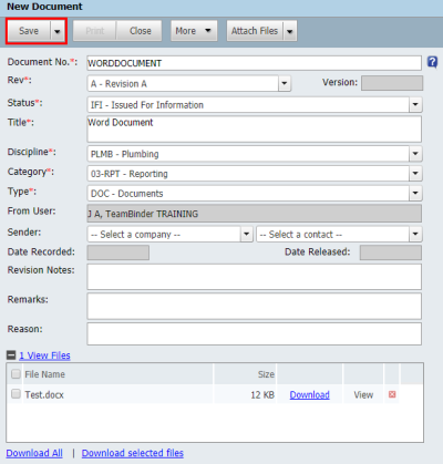 Click Save once complete. This will upload the document into InEight Document. If PDF has been selected, then a PDF copy is automatically attached to the document as well.
