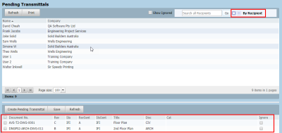 Change the view by using the View by Document option at the top right. This shows documents previously transmitted and now revised in the upper window with the recipients listed in the lower part.