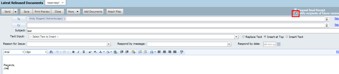 If this option is not selected, the user will not be notified automatically about revisions to documents transmitted to them. In this case awareness of document revisions that have been released and not transmitted to recipients who were transmitted the previous revision is required. This is managed in InEight Document via Pending Transmittals.