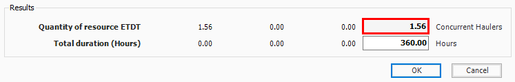 On the Haul Calculator, select the Calculate quantity of ETDT required to complete haul in duration entered below radio button. (ETDT is the resource code for the Dump Truck you selected.)