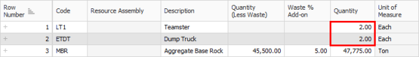 Your cost item now shows a quantity of 1.56. Round up the Quantity to 2. Also, adjust the Teamster Quantity to 2 (if needed).