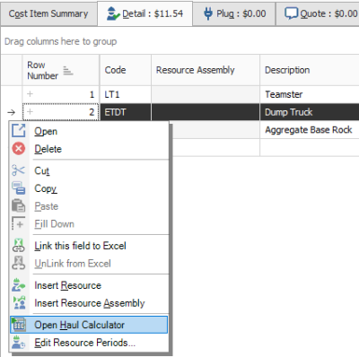 Right click on the ETDT – Dump Truck row header and select Open Haul Calculator.