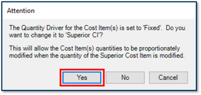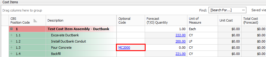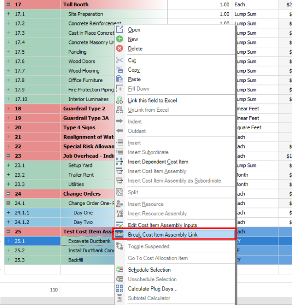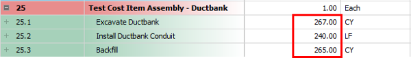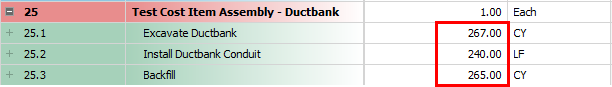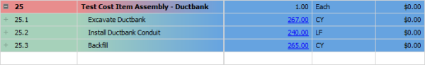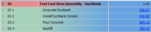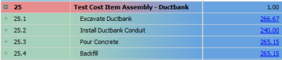 Employed Cost Item Assemblies are read-only cost items in the CBS register, but the inputs that were provided by the user to create the cost items can be modified to update the resulting cost items. If you change one variable in the cost item assembly, it will automatically update all associated cost items.