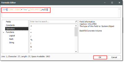 Using the Iif(, , ) function from the Functions tab, and the existing Volume3 calculations from the Fields tab, enter in the following formula, then click OK.
