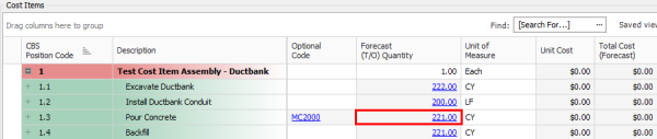 Once the cost items are inserted into the CBS, you can hover over Forecast (T/O) Quantity to see the associated calculation.