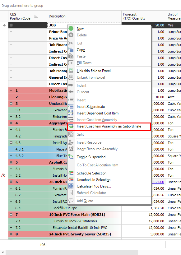Once your Cost Item Assemblies are created, the cost items must be inserted into the CBS Register. They can be inserted as a subordinate or new cost item anywhere in the CBS hierarchy. To do so, you right click on the position code where you want to place the cost item assembly and select to either insert the assembly as subordinate cost items or as new cost items.