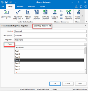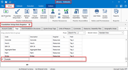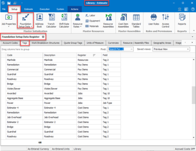 A master set of Tags is created and stored in the Master Foundation Setup Data - Tags tab of the Library. When you create a new folder, the master set is automatically copied from the Library to the new folder. If you feel the current job requires new or different Tags to adequately categorize its cost items and resources, you can change, create, or delete them any time you want.
