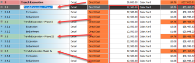 You have miles of trench work that you need to break up into phases. You have already defined this trench cost item and entered the details defining the total cost to perform the work. You can split this cost item into 4 phases of work by using the Split feature.