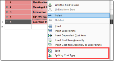 The Split feature changes your Cost Breakdown Structure. Before performing these steps, be sure you have the correct cost item selected for splitting and whether or not the change is needed.