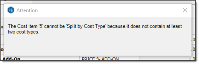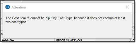 Right click on a new Cost Item under Guardrail Type 2, and select Split by Cost Item. You can use this option if there at least two types. If not, you will get this pop-up: