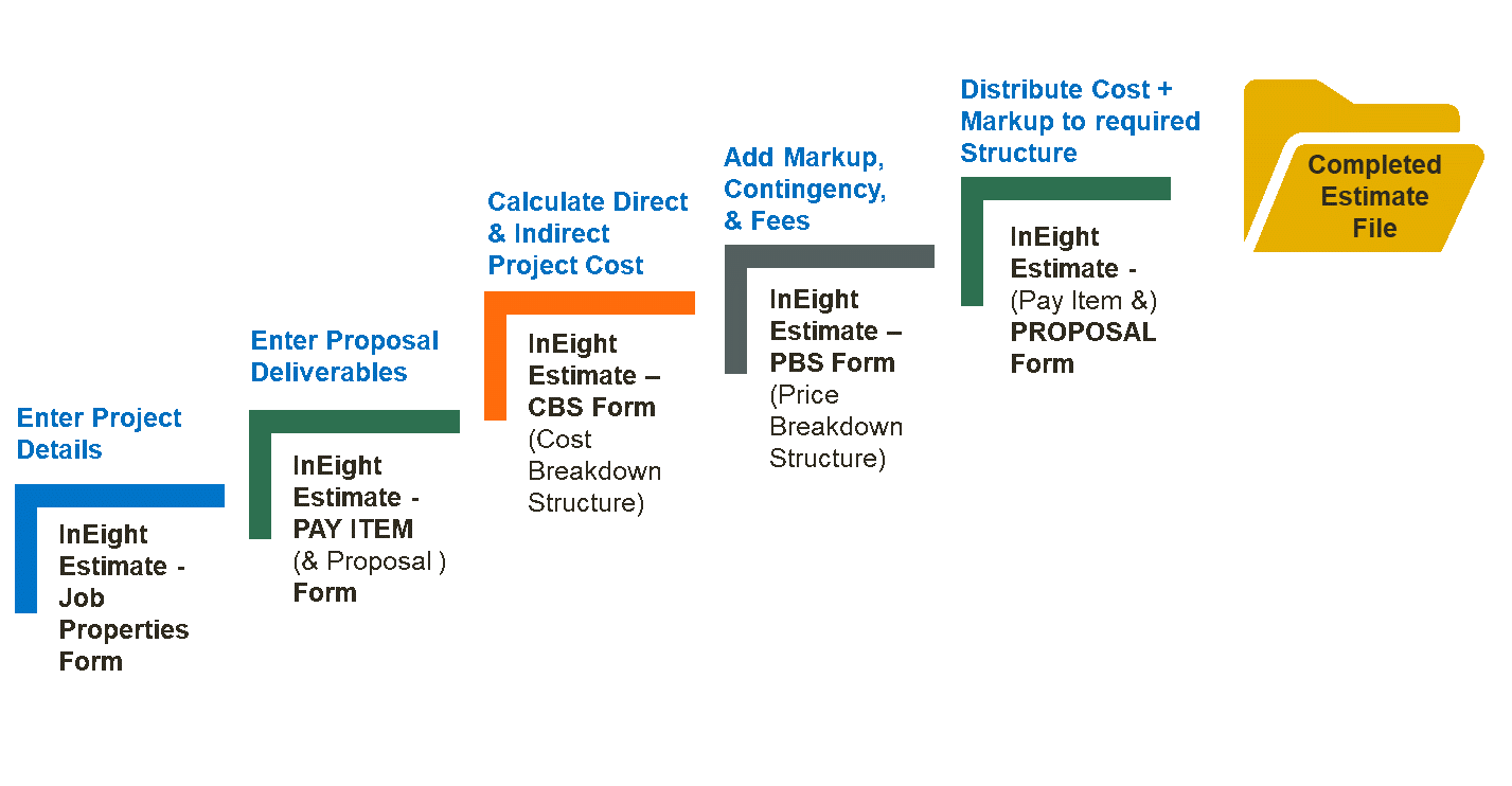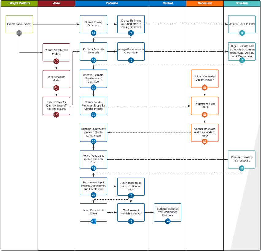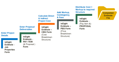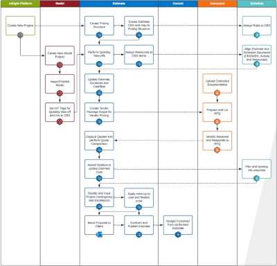 This workflow illustrates the key processes in InEight Estimate and other related InEight applications used for the Estimating and Pricing business process, and how those processes are interdependent.