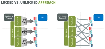 This diagram illustrates how cost items relate to pay items depending on if the Lock Cost Items to Pay Items rule is selected in Job Properties.