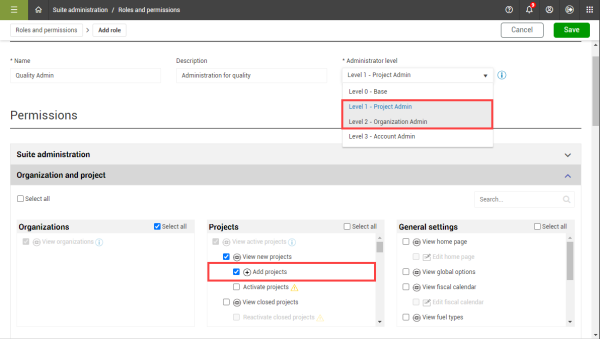 Add projects permission extended beyond root level - The Add projects permission has been exended to level 1 and level 2 role users for root and sub-organizations. Now, you can create your own projects in Platform.
