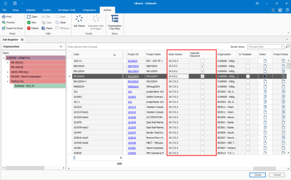 Updated Data Version and new Upgrade Required columns in the Job Register - The column labeled Version has been updated to Data Version to help identify the data version of the job, and a new Upgrade Required column has been added to identify whether an upgrade is required for the job.