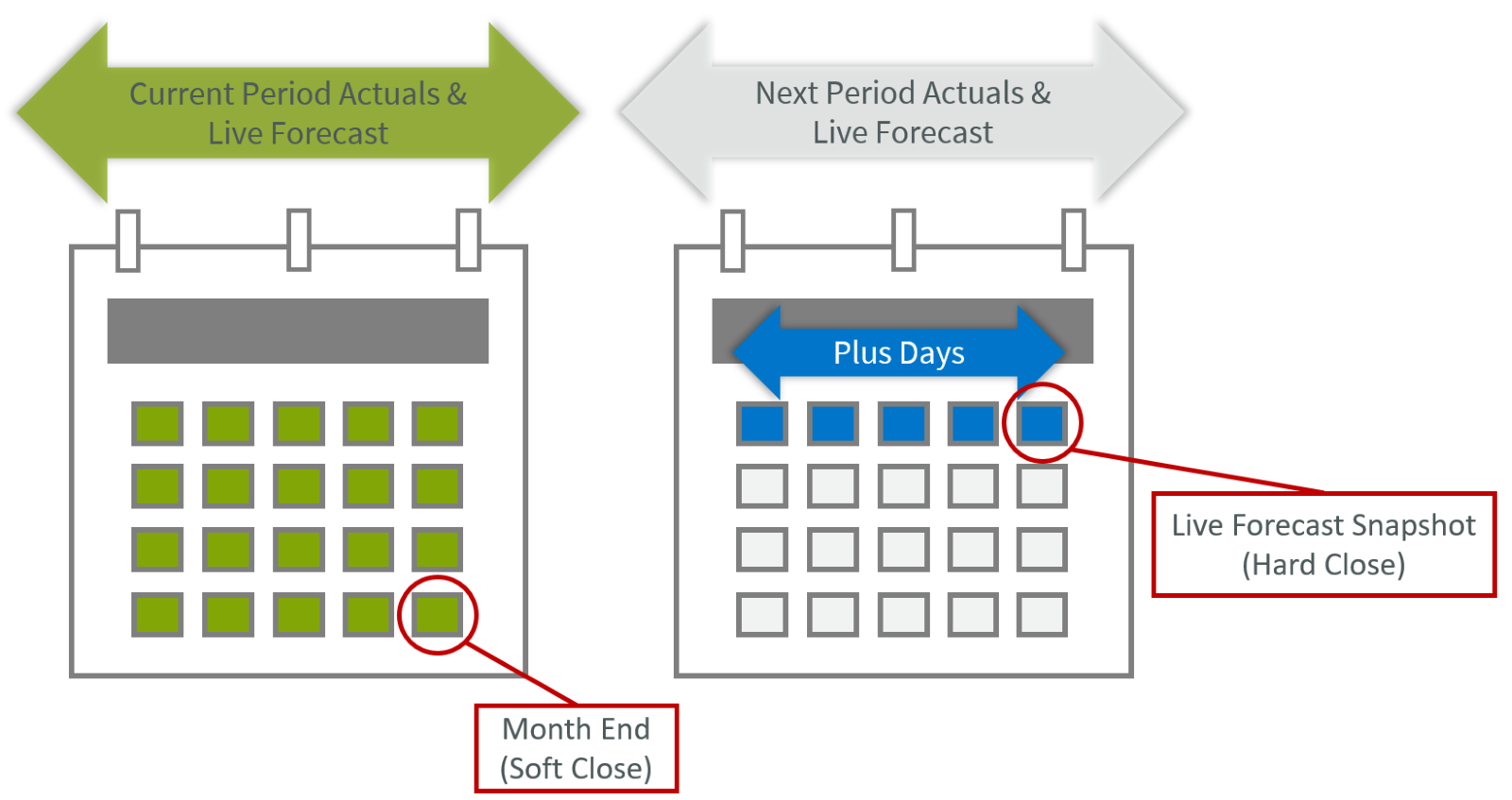 Month-end reports are prepared over “plus days” – a suspended period during which the project team can finalize the forecast numbers without incurring any new actuals.