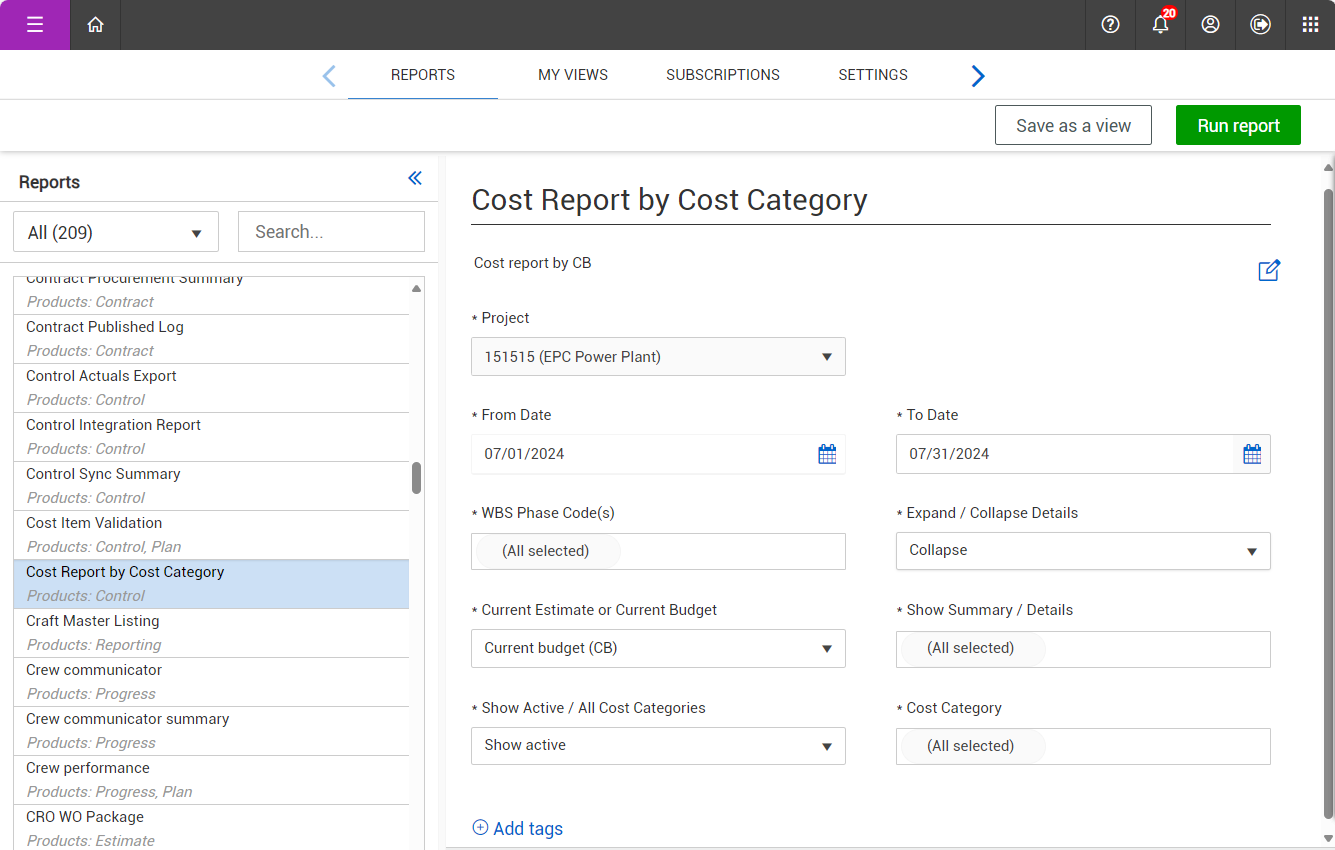InEight Report has a variety of preconfigured reports to help you monitor key performance indicators. After you select a report, you can refine the parameters to meet your specific needs.