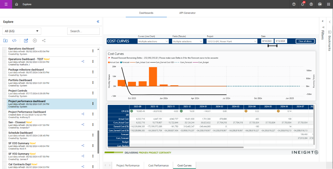 Use InEight Explore to analyze budgeting and forecasting details through self-service dashboards and analytics. You can use pre-defined dashboards, create custom dashboards, and integrate data from other systems.