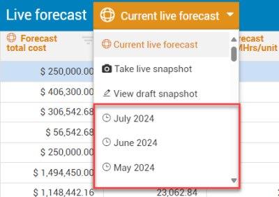 If the setting is enabled, users with the correct permissions can take a manual snapshot, which will then be saved as the Live Forecast snapshot. If a manual snapshot has not been saved during the month, the system will automatically save a Live Forecast snapshot on the month-end day.