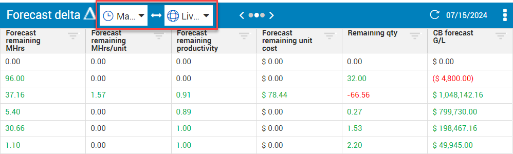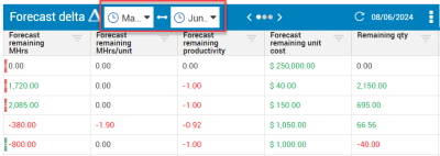 Snapshots can also be selected in the Forecast Delta data block to easily compare two periods. Green and red coloring show increases or decreases between the two periods, respectively.