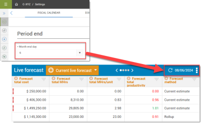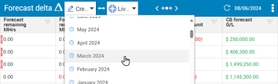 The month-end day for the previous period was the 6th, so a new Live Forecast snapshot was taken automatically by the system on that day. The project controller can view this snapshot in the Live Forecast data block.