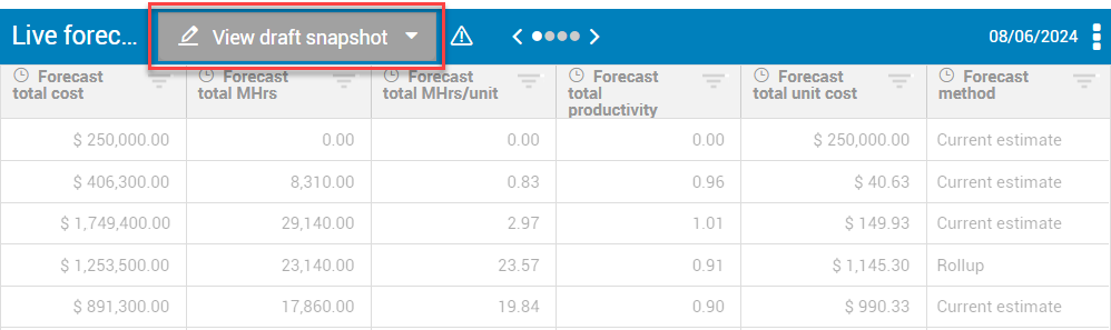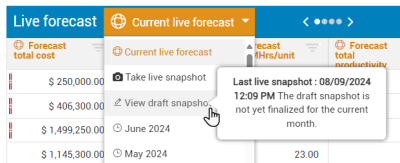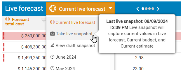The project controller wants to capture forecast details as of today. From the drop-down menu, she clicks Take live snapshot. This overwrites the last draft snapshot from the 9th.