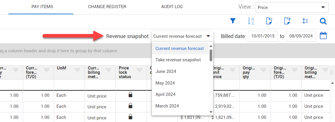 In addition to project forecasts, you can also capture revenue snapshots on the Pay Items register.