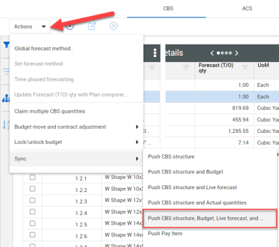 To push the forecast to the ERP, start on the Actions menu. Select Sync > Push CBS structure, Budget, Live forecast, and Actual qty.
