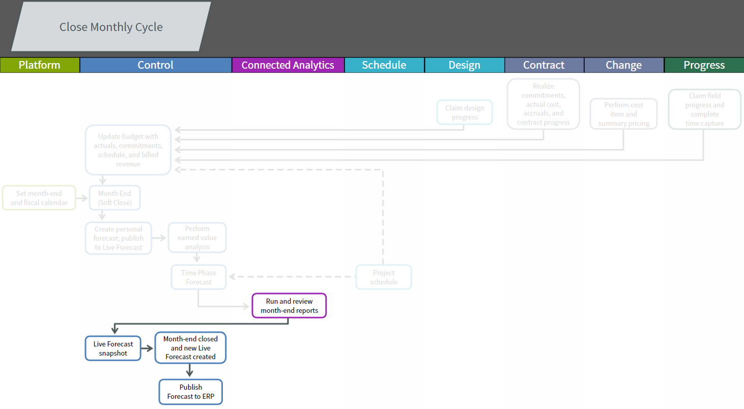 To close out month-end reporting, a Live Forecast snapshot is taken and a new Live Forecast is created for the next period. If your organization uses an ERP system, you can publish the month-end forecast to the ERP to keep project data up to date.