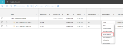 Return to the Project List view to access the copy of the schedule. Under the column Schedule type, open the drop-down menu and select Active Baseline.