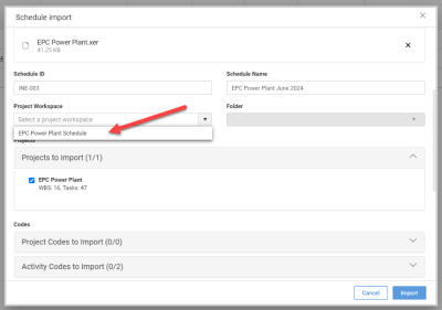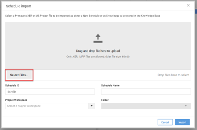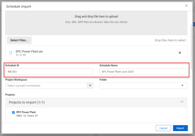 If you have an XER or MS project file prepared, you can import it directly into the workspace. Follow the steps below to import a schedule: